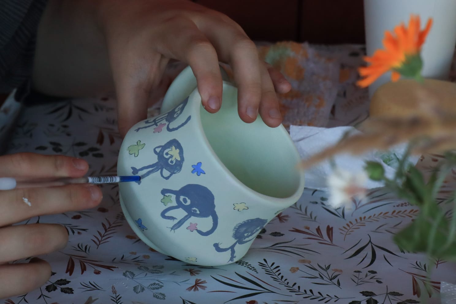 Når I er færdige med at male, tager jeg emnerne med hjem, glaserer det med en fødevaresikker transparent glasur og brænder det til færdigt keramik. I får besked, når det kan afhentes